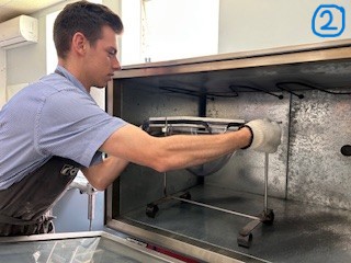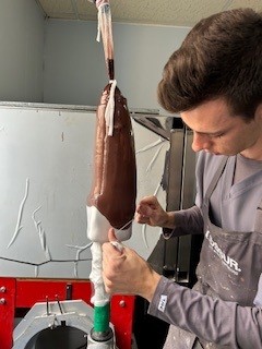 To manufacture the socket, the material is placed inside an apparatus that suspends the plastic inside of an oven. As the plastic is heated, it begins to sag and droop. At the correct length, the plastic is taken out of the oven and draped over the positive cast of the residual limb. Once the plastic has been draped over the cast, vacuum is applied to the system so that the soft plastic can conform to the cast contours and once cooled, holds this shape.